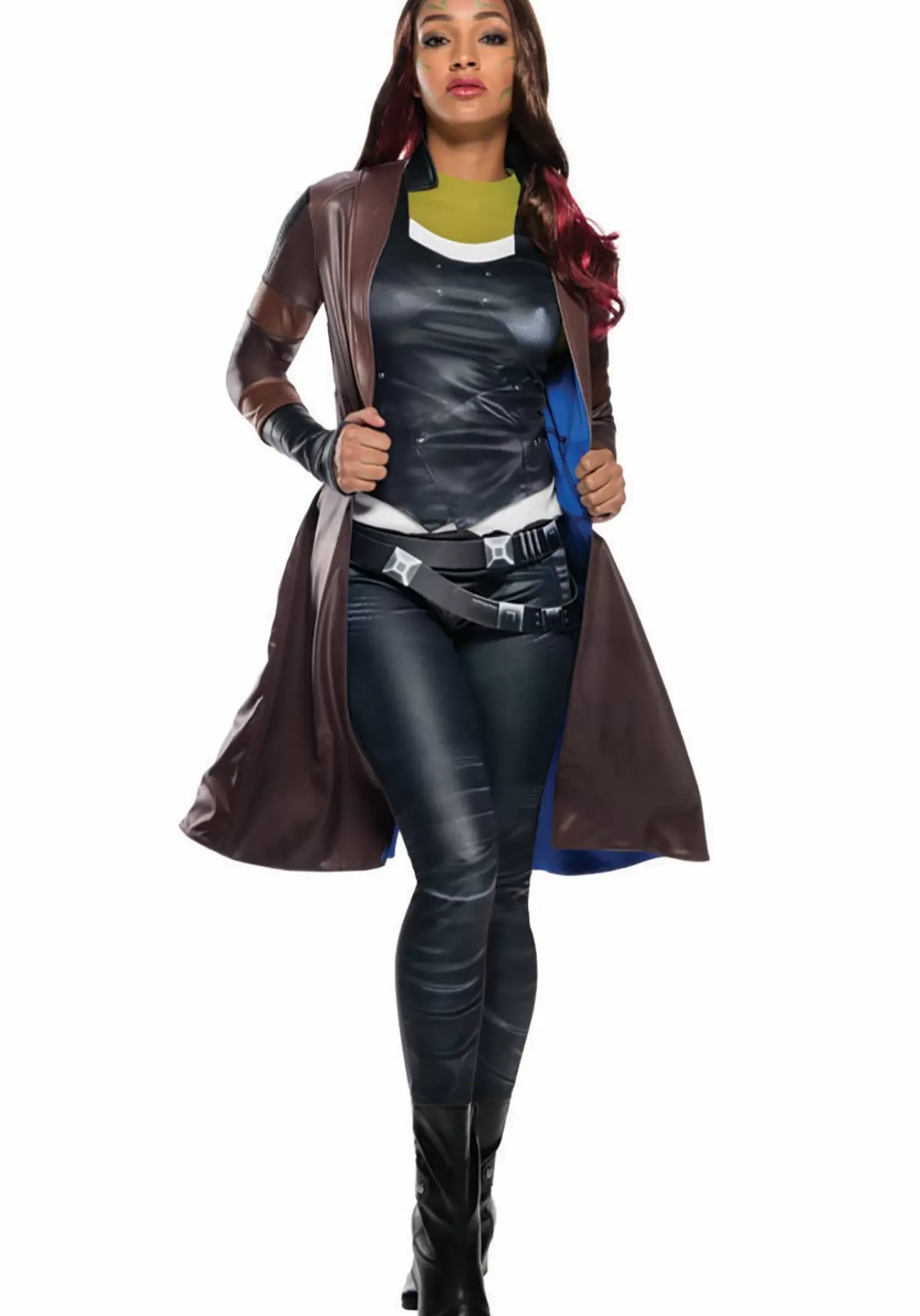 Be The Fiercest And Talented Hero You Are In This Officially Licensed Deluxe Gamora Coat For Women! The Coat’s Hem Ends At Your Knees And Is Made Of Brown Faux Leather. Black Faux Leather Bands Circle The Sleeves For An Ultra-Cool Effect. The Inside Of The Coat Is Lined With Striking Blue Fabric. Use It To Finish Off Your Galactic Warrior Costume This Halloween!