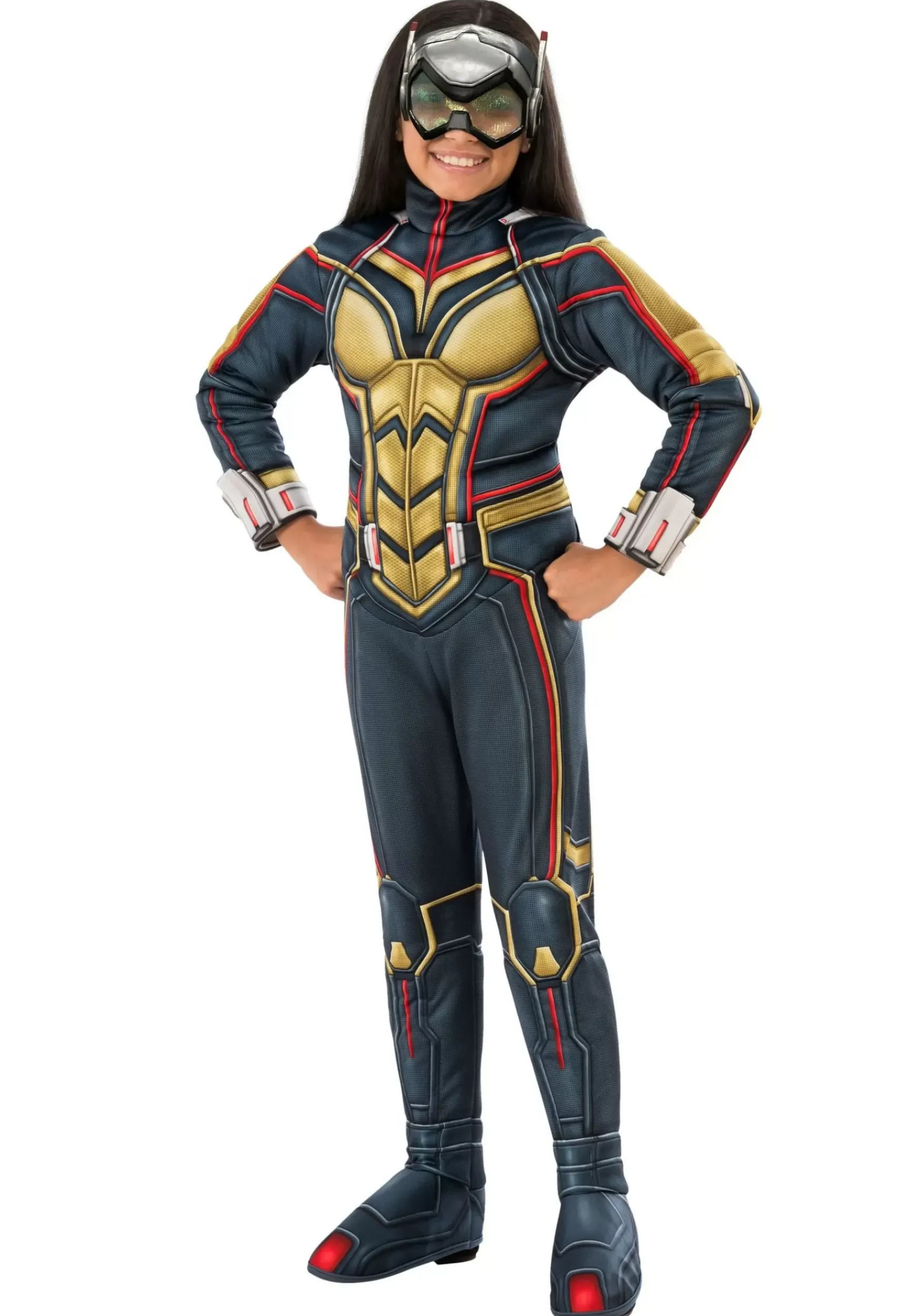 This Child Wasp Costume Looks Like The Suit Worn By Hope Van Dyne In Ant-Man And The Wasp. It’s A Dark Blue Jumpsuit That Has Plenty Of Details From The Movie. Printed Yellow Armor Decorates The Front And Red Outlines Along The Chest, Arms, And Legs Add A Pop Of Color To The Outfit. The Legs End In Boot Covers That Can Be Worn Over Most Pairs Of Shoes. To Finish It All Off, The Eye Mask Has A Visor That Fits Over Your Child’s Face With An Elastic Band.