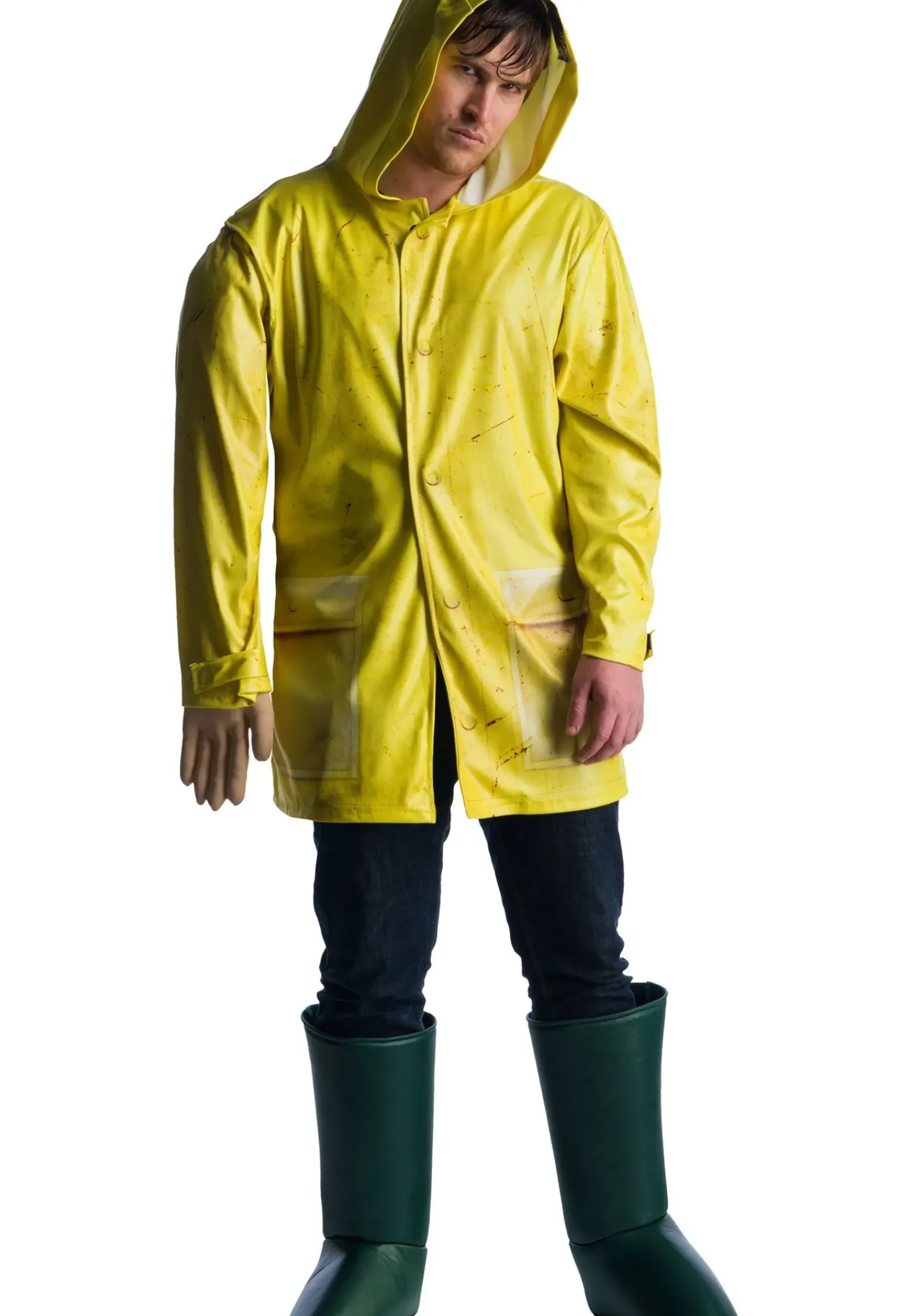 The It Georgie Costume For Men Explores The Possibility Of An Adult-Georgie Coming Face To Face With Pennywise’s Razor-Sharp Teeth. The Hooded Yellow Raincoat Features Blood Spatters, Printed Pockets, And A Row Of Snap Buttons. It May Appear To Be A Normal Raincoat But Pull One Of The Arms For A Horrific Surprise. The Right Arm Detaches Completely From The Rest Of The Costume And Makes For A Fun (And Scary) Party Trick That Just May Lead To A Few Shrill Screams. The Hand Attachment Is Made From Flesh-Colored Rubber So It’s Bound To Fool A Few Folks. The Costume Also Comes With Rainboot Shoe Covers To Complete Georgie’s Infamous Rainy Day Look.