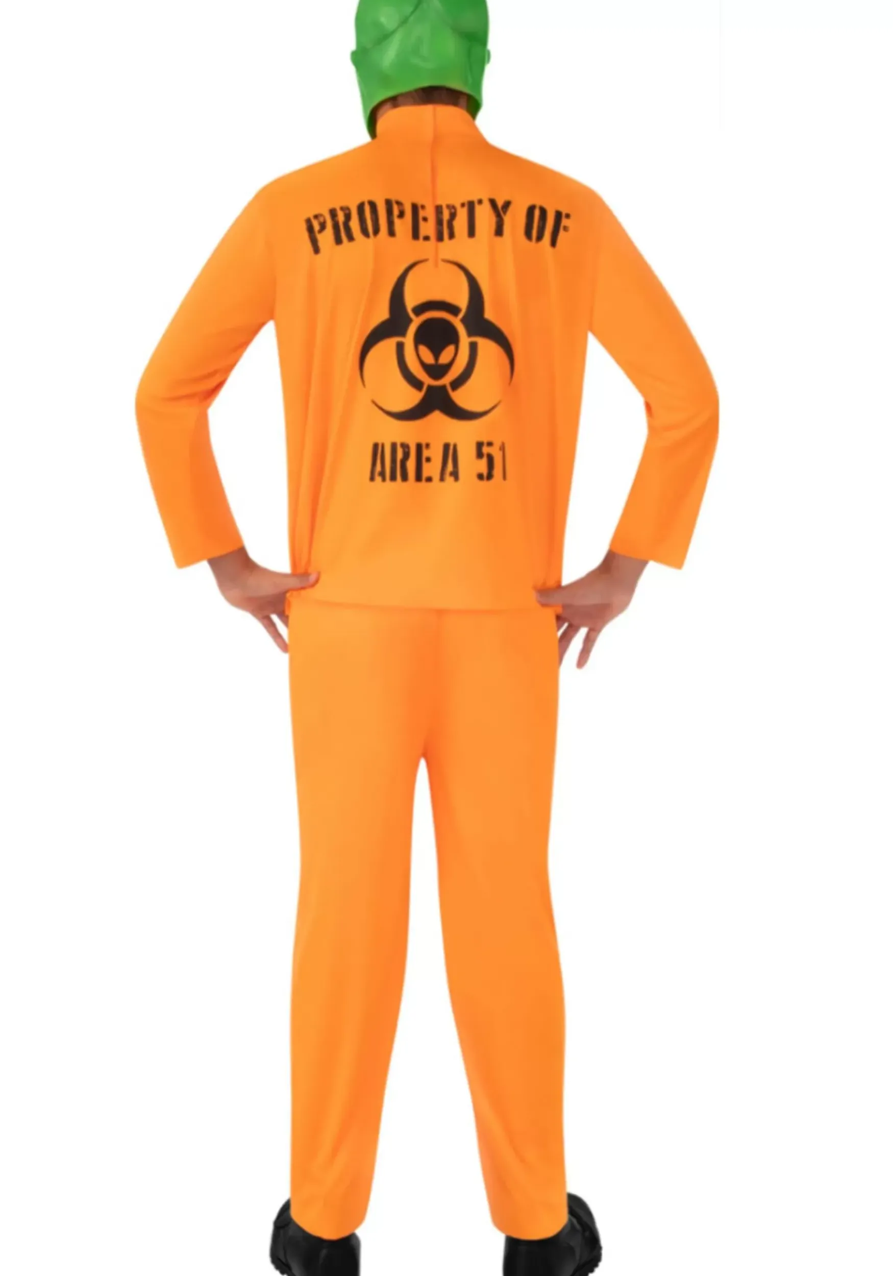 This Adult Area 51 Escapee Costume Transforms You Into An Alien On The Loose! It Starts With A Bright Orange Shirt That Has A Fastener At The Back Of The Neck For Fitting. It Also Has “Property Of Area 51” Printed On The Front To Let Everyone Know Where You Came From! The Matching Orange Pants Feature An Elastic Waistband To Ensure A Snug, Yet Comfortable Fit. Finally, The Molded Latex Mask Completes Your Transformation! It’s Bright Green And Has Big, Black, Bulbous Eyes In Front To Give You The “Little Green Man” Sort Of Look. Once You Put It All On, You’Ll Be Ready To Explore Extra-Terrestrial Enigmas In The Universe!