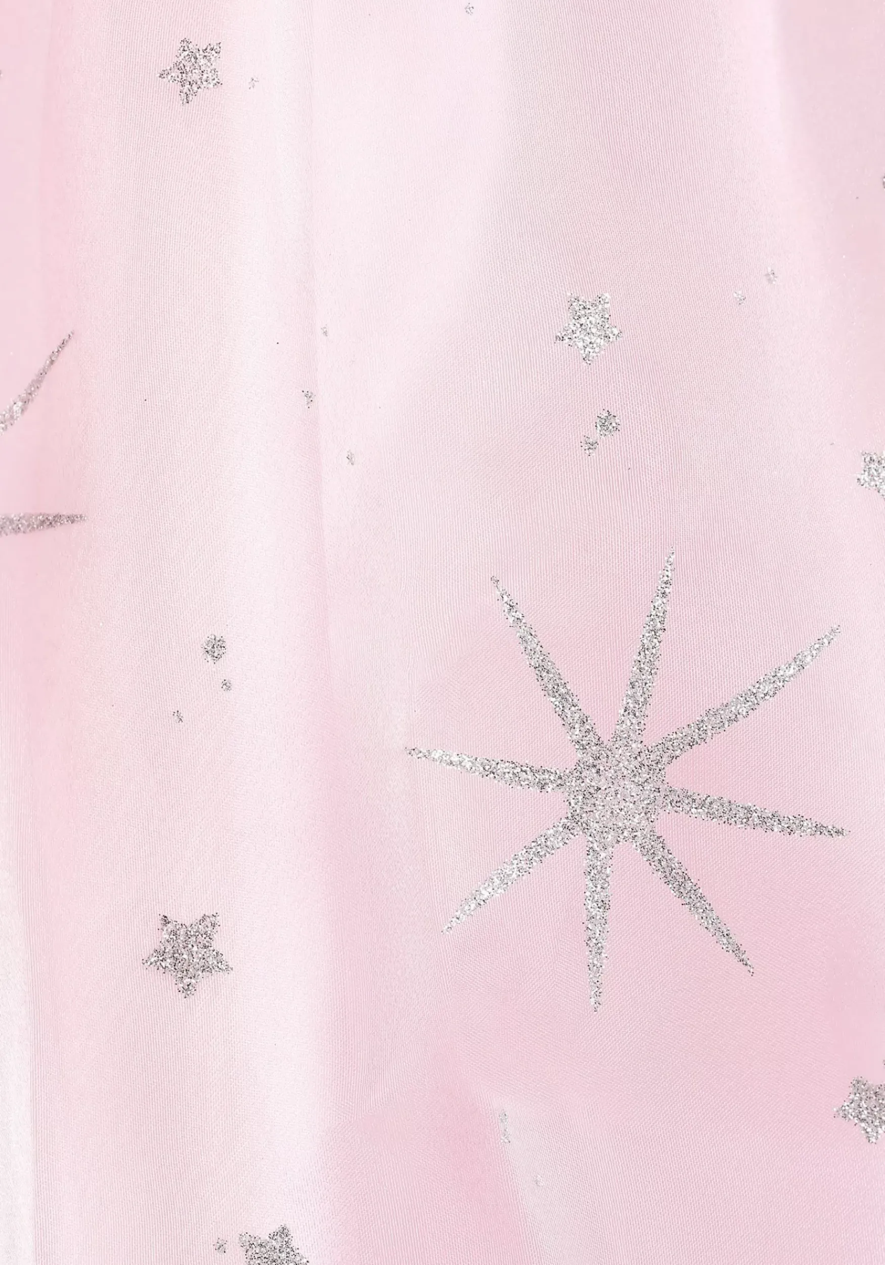 - Satin Dress Has Organdy Yoke, Sleeves & Skirt Overlay; Organdy Is Sprinkled W/ Silver Glitter Stars