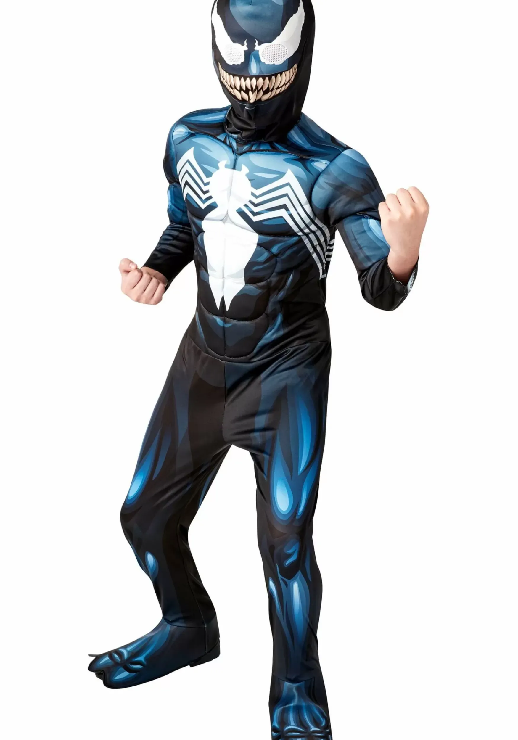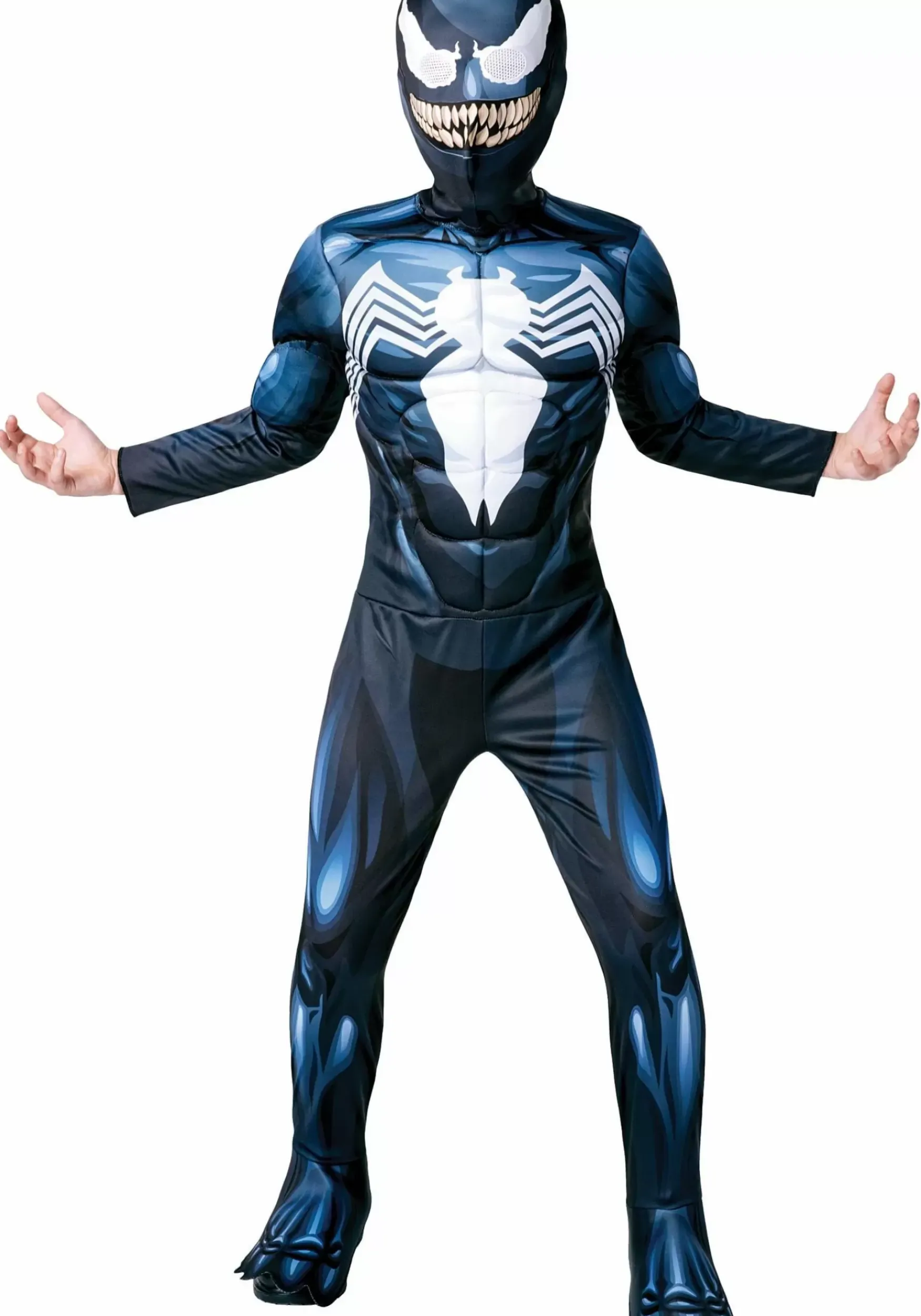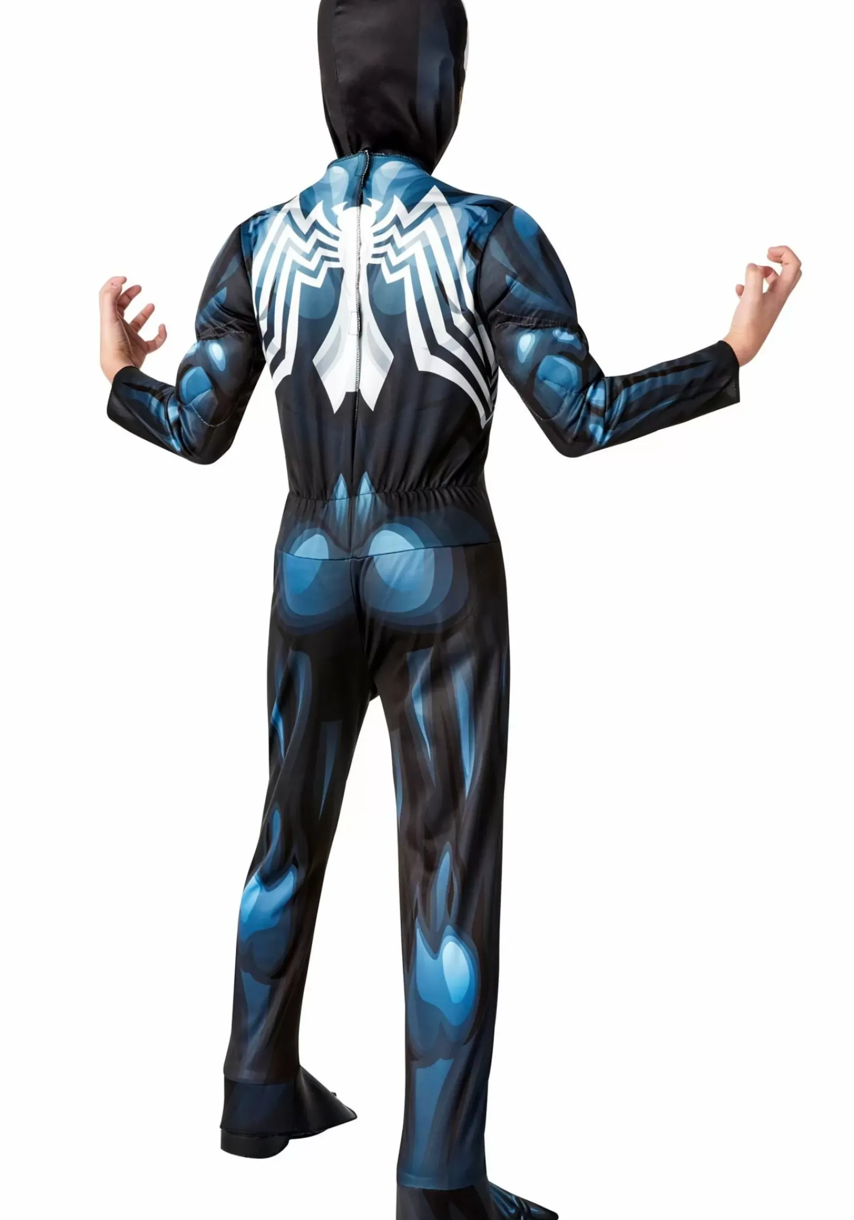 Your Child Can Unleash All Kinds Of Abilities With This Marvel Deluxe Venom Costume! The Jumpsuit Has Fiberfill Padding In The Chest And Shoulders So Your Kid Can Achieve A Superhuman Physique Without The Superhuman Gym Routine. The Attached Foam Boot Covers On The Legs Ensure That Any Dark Pair Of Shoes Will Match The Costume. The Hood And Mask Combination Will Cover Your Kid’s Entire Face, Just Like The Symbiote, And Has Mesh-Covered Eye Openings For A Limited Range Of Vision. (Unfortunately, We Haven’T Figured Out How To Make It Grant The Wearer X-Ray Vision Yet.)