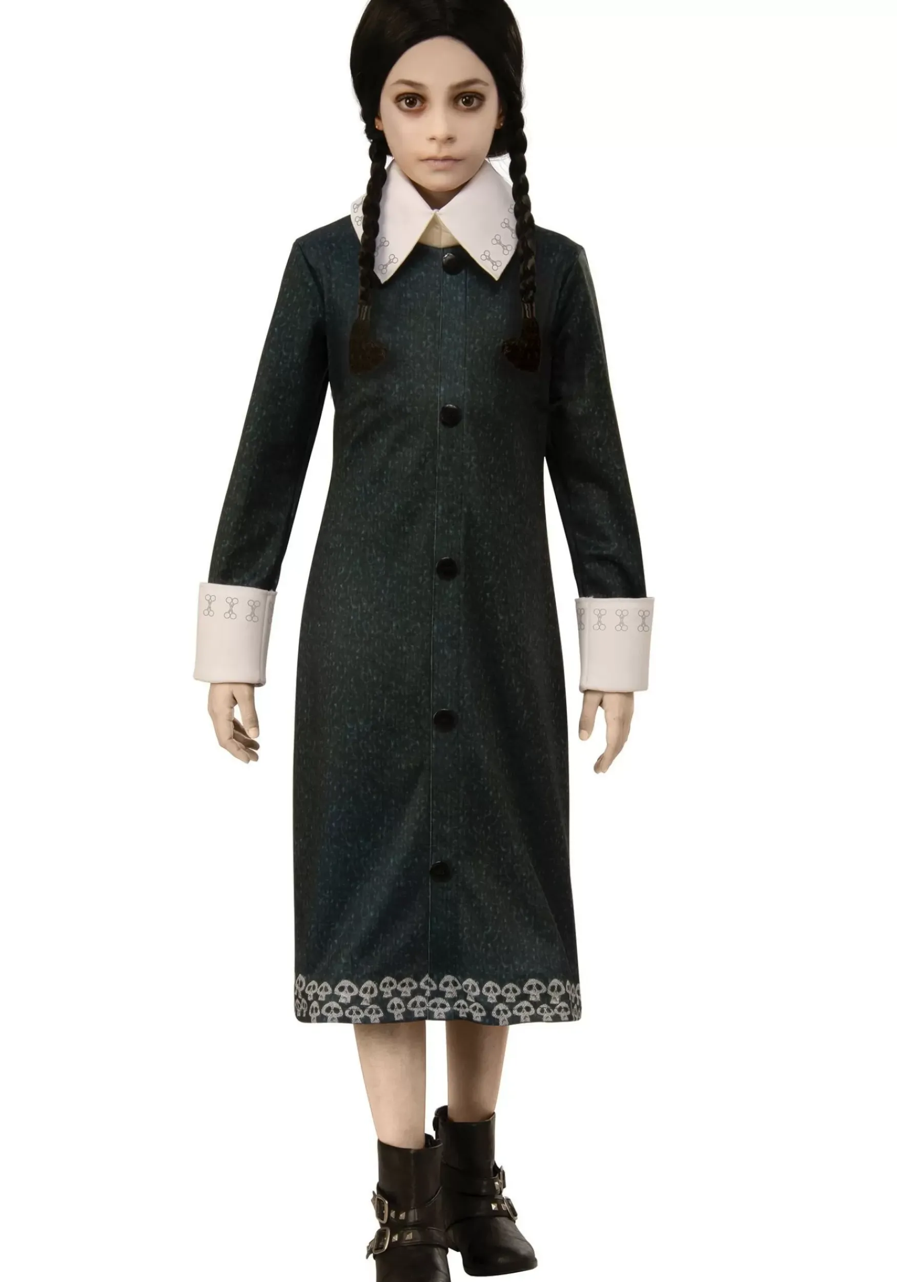 This Unique Licensed Wednesday Addams Costume Is Channeling The 2019 Cartoon Version Of Her Trademark Collared Black Dress. The Ensemble Has A Dramatic Collar And Matching Cuffs Made Of Foam For A Cartoonish Look. The Dress Has Decorative Buttons Down The Front And Skulls Printed Around The Hem. Fastened In Back With A Hook And Loop Strip, This Costume Is Easy To Change Into Before The Halloween Festivities Start. Pair This Costume With Black Braids And A Silent, Serious Demeanor, And Your Child Will Be Ready To Roll In No Time!