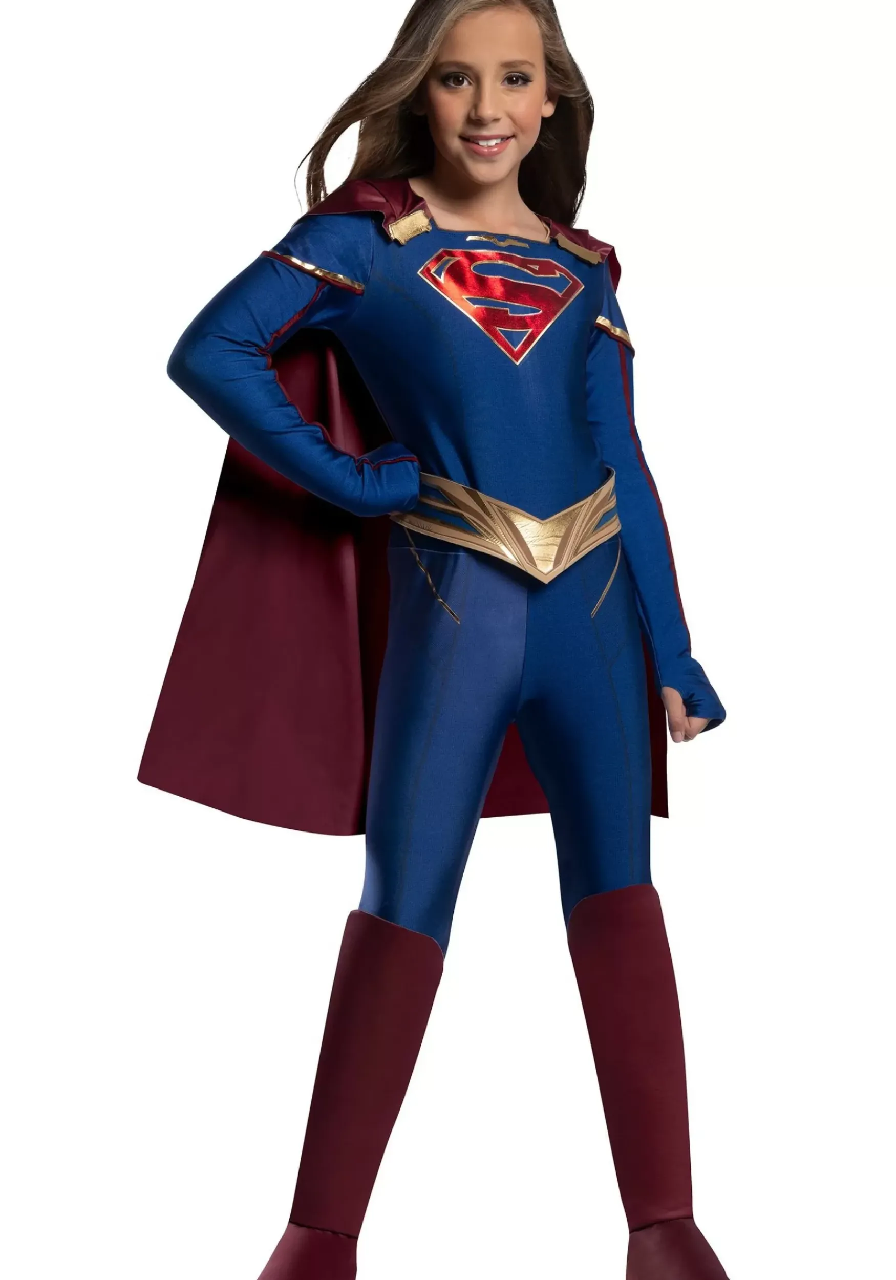 This Supergirl Costume Has The Iconic Look That’s Inspired By The Dc Superhero. The Costume Comes With Blue Jumpsuit That Has Plenty Of Printed Details On The Exterior. It Also Features The Large “S” Shield On The Chest To Add That Heroic Appeal To It. The Costume Comes With Red Boot Covers That Fit Over Most Shoes, So Your Child Can Wear Her Favorite Pair Of Shoes With The Outfit. The Gold Foam Belt Mimics The Look From The Television Series. Every Great Hero Needs A Cape, And This Costume Comes With A Brilliant Red Cape That Attaches To The Shoulders. Put It All Together And You Have A Heroic Look That Requires No Superpowers!